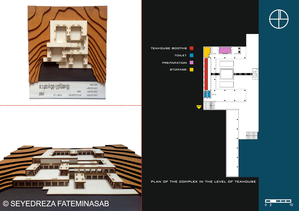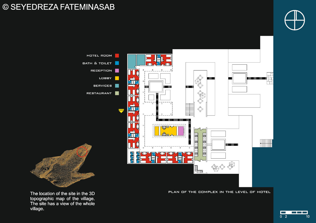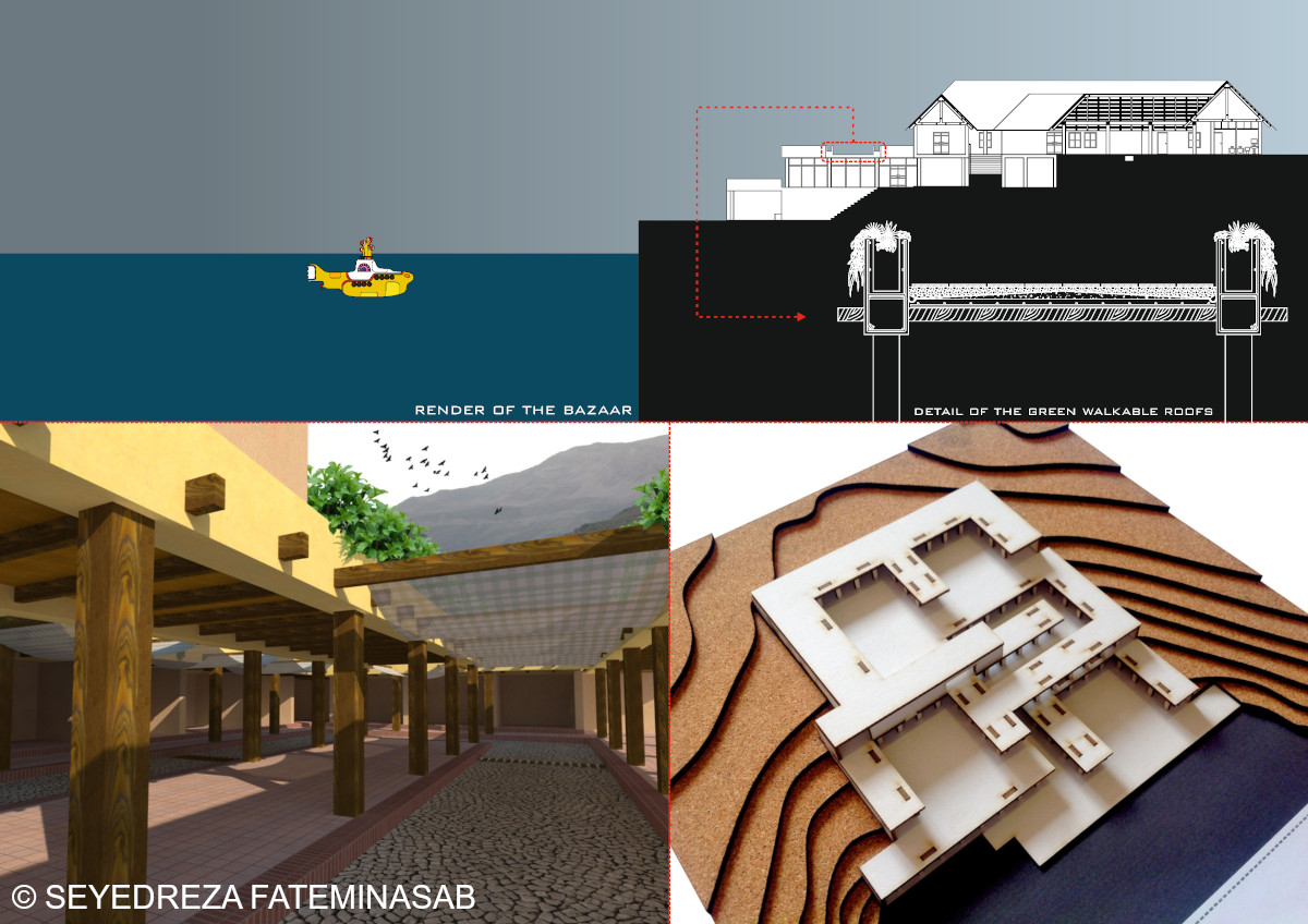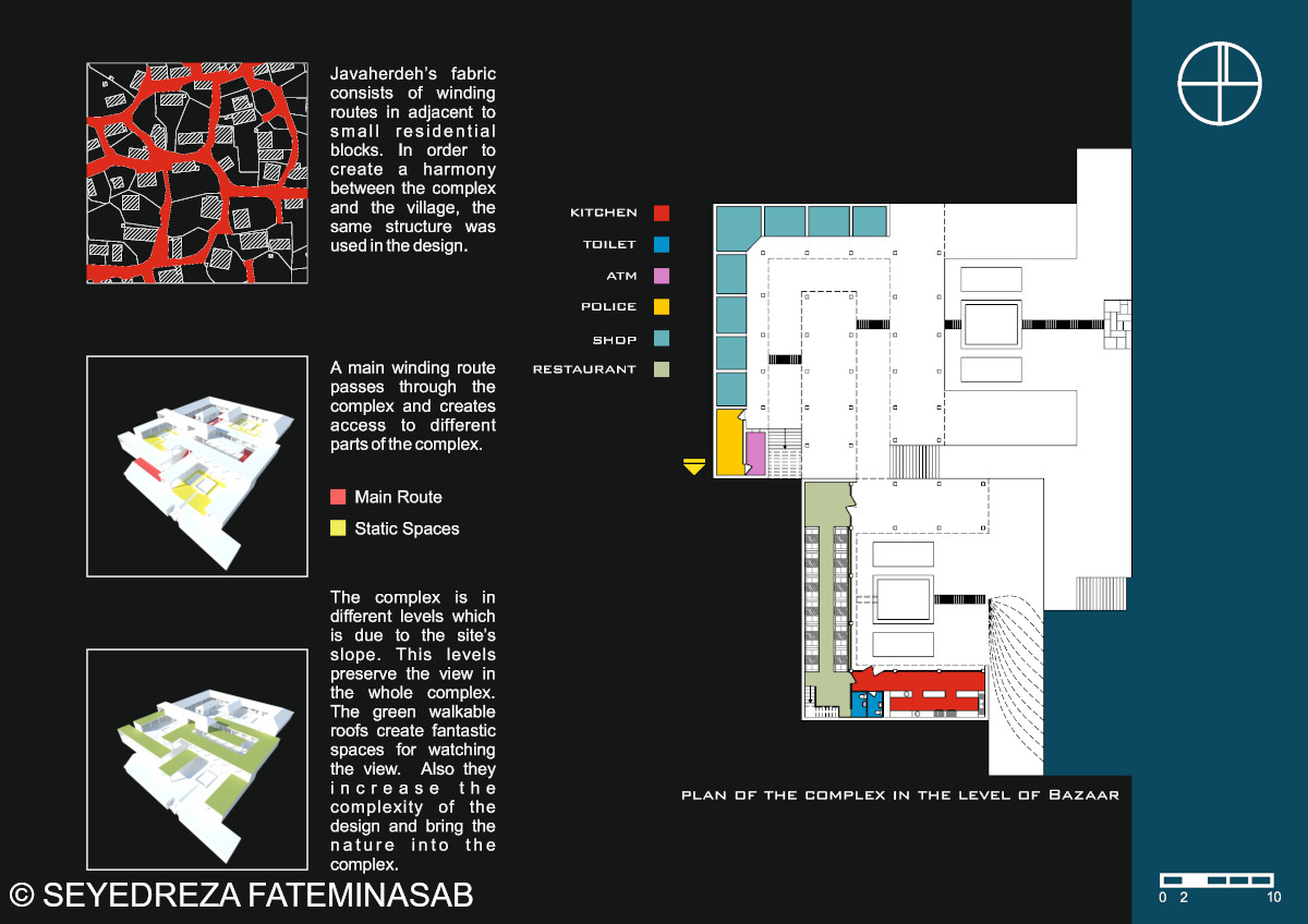 Javaherdeh is a small village in north of Iran. Located in the mountains overlooking the Caspian Sea, it’s famous for its cool weather during summer and attracts a large number of tourists during warm seasons. The objective of this course was to design a Tourists Center in the west end of the village, in a large steep site inside a valley, beside a lake. The site has a great view, looking down at the village. A small stream of water passes through the site until it reaches the lake. This stream was directed in my design in order to create an appropriate atmosphere in all parts of the complex. The Tourists’ Center was supposed to create a relax environment for tourists to stay during the night and walk, dine and shop during the day. The complex was expected to be in harmony with the surrounding natural environment and the fabric of the village.