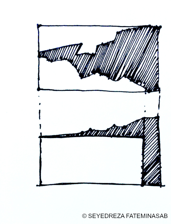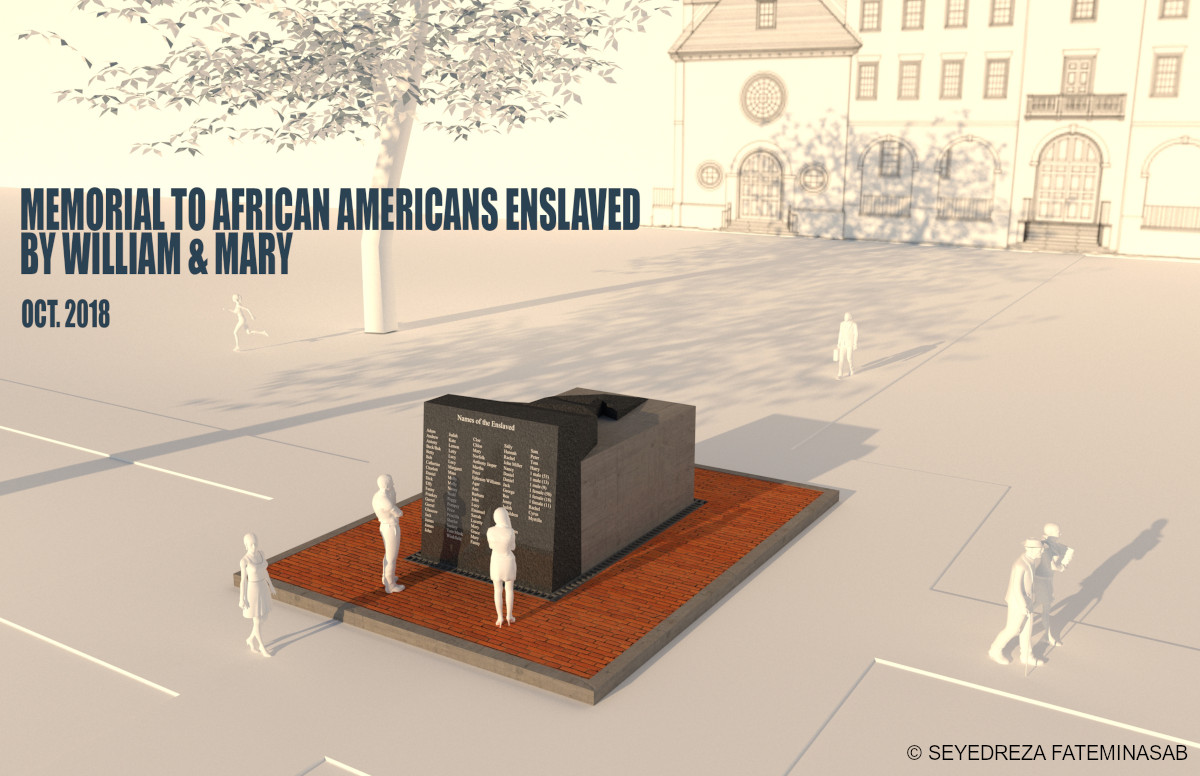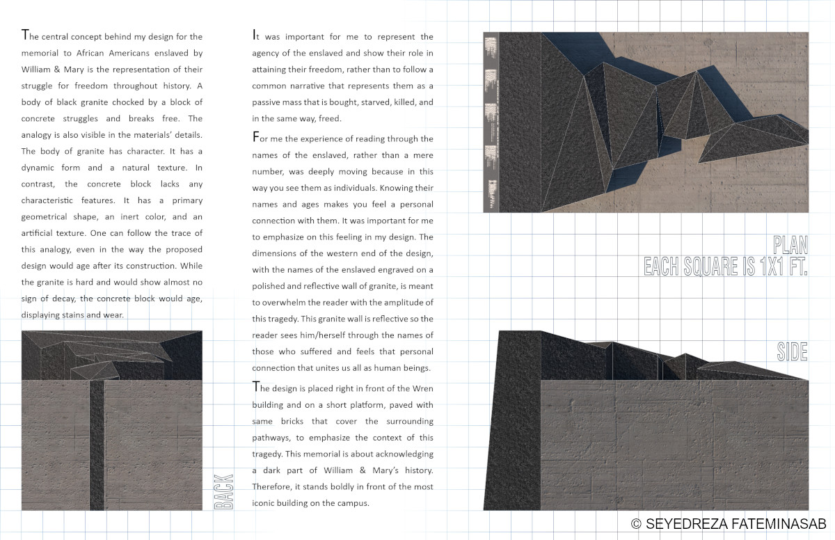 The central concept behind my design for the memorial to African Americans enslaved by William & Mary is the representation of their struggle for freedom throughout history. A body of black granite chocked by a block of concrete struggles and breaks free. The analogy is also visible in the materials’ details. The body of granite has character. It has a dynamic form and a natural texture. In contrast, the concrete block lacks any characteristic features. It has a primary geometrical shape, an inert color, and an artificial texture. One can follow the trace of this analogy, even in the way the proposed design would age after its construction. While the granite is hard and would show almost no sign of decay, the concrete block would age, displaying stains and wear.