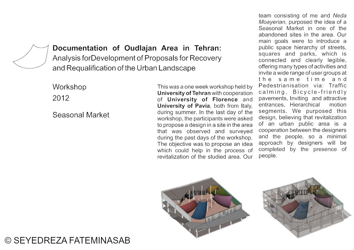 This was a one-week workshop held by University of Tehran with cooperation of University of Florence and University of Pavia, both from Italy, during summer. In the last day of the workshop, the participants were asked to propose a design in a site in the area that was observed and surveyed during the past days of the workshop. The objective was to propose an idea which could help in the process of revitalization of the studied area. Our team consisting of me and Neda Moayerian, purposed the idea of a Seasonal Market in one of the abandoned sites in the area. Our main goals were to introduce a public space hierarchy of streets, squares and parks, which is connected and clearly legible, offering many types of activities and invite a wide range of user groups at the same time and Pedestrianization via: Traffic calming, Bicycle-friendly pavements, Inviting and attractive entrances, Hierarchical motion segments. We purposed this design, believing that revitalization of an urban public area is a cooperation between the designers and the people, so a minimal approach by designers will be completed by the presence of people.