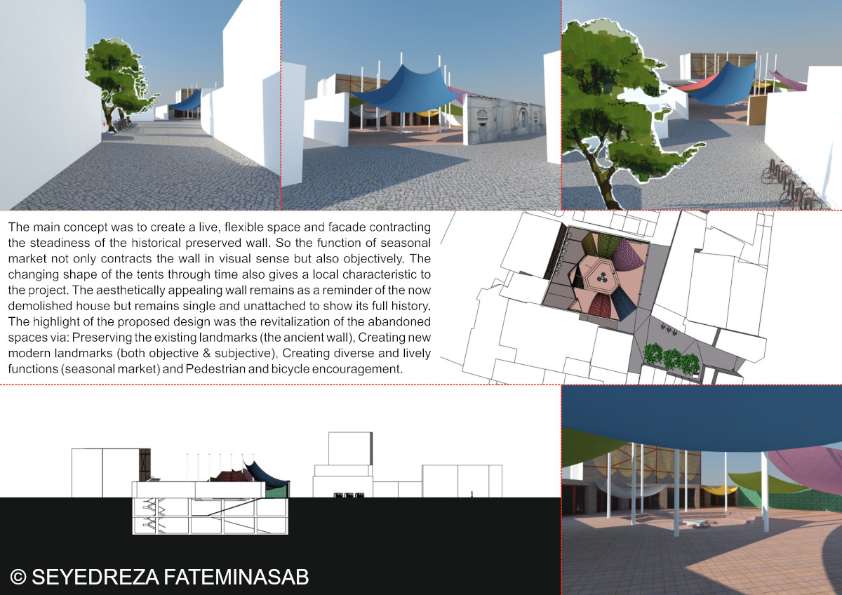 The main concept was to create a live, flexible space and facade contracting the steadiness of the historical preserved wall. So, the function of seasonal market not only contracts the wall in visual sense but also objectively. The changing shape of the tents through time also gives a local characteristic to the project. The aesthetically appealing wall remains as a reminder of the now demolished house but remains single and unattached to show its full history. The highlight of the proposed design was the revitalization of the abandoned spaces via: Preserving the existing landmarks (the ancient wall), Creating new modern landmarks (both objective & subjective), Creating diverse and lively functions (seasonal market) and Pedestrian and bicycle encouragement.