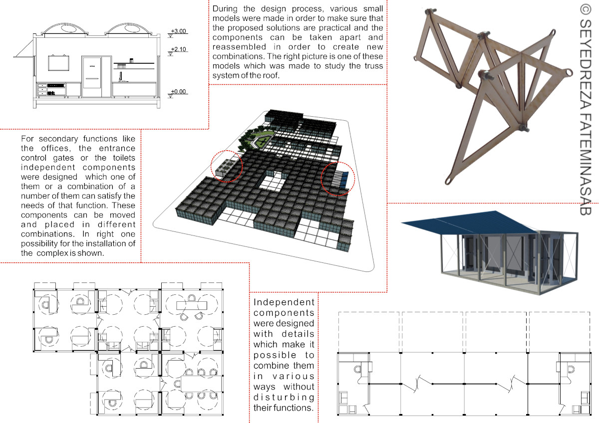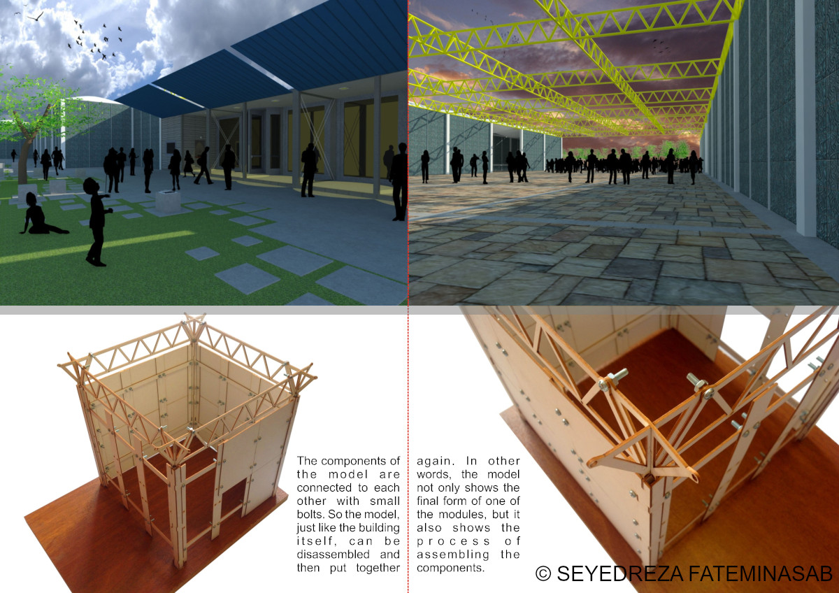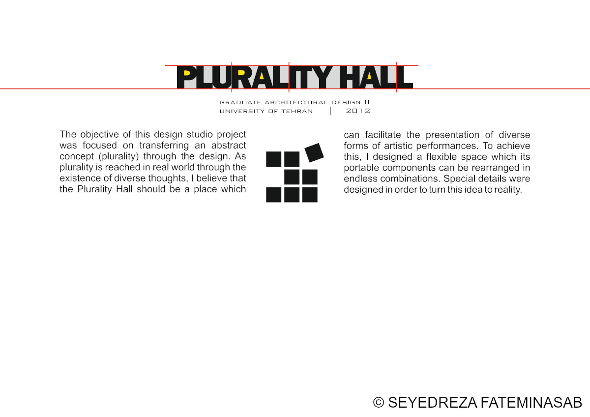 The objective of this design studio project was focused on transferring an abstract concept (plurality) through the design. As plurality is reached in real world through the existence of diverse thoughts, I believe that the Plurality Hall should be a place which can facilitate the presentation of diverse forms of artistic performances. To achieve this, I designed a flexible space which its portable components can be rearranged in endless combinations. Special details were designed in order to turn this idea to reality.