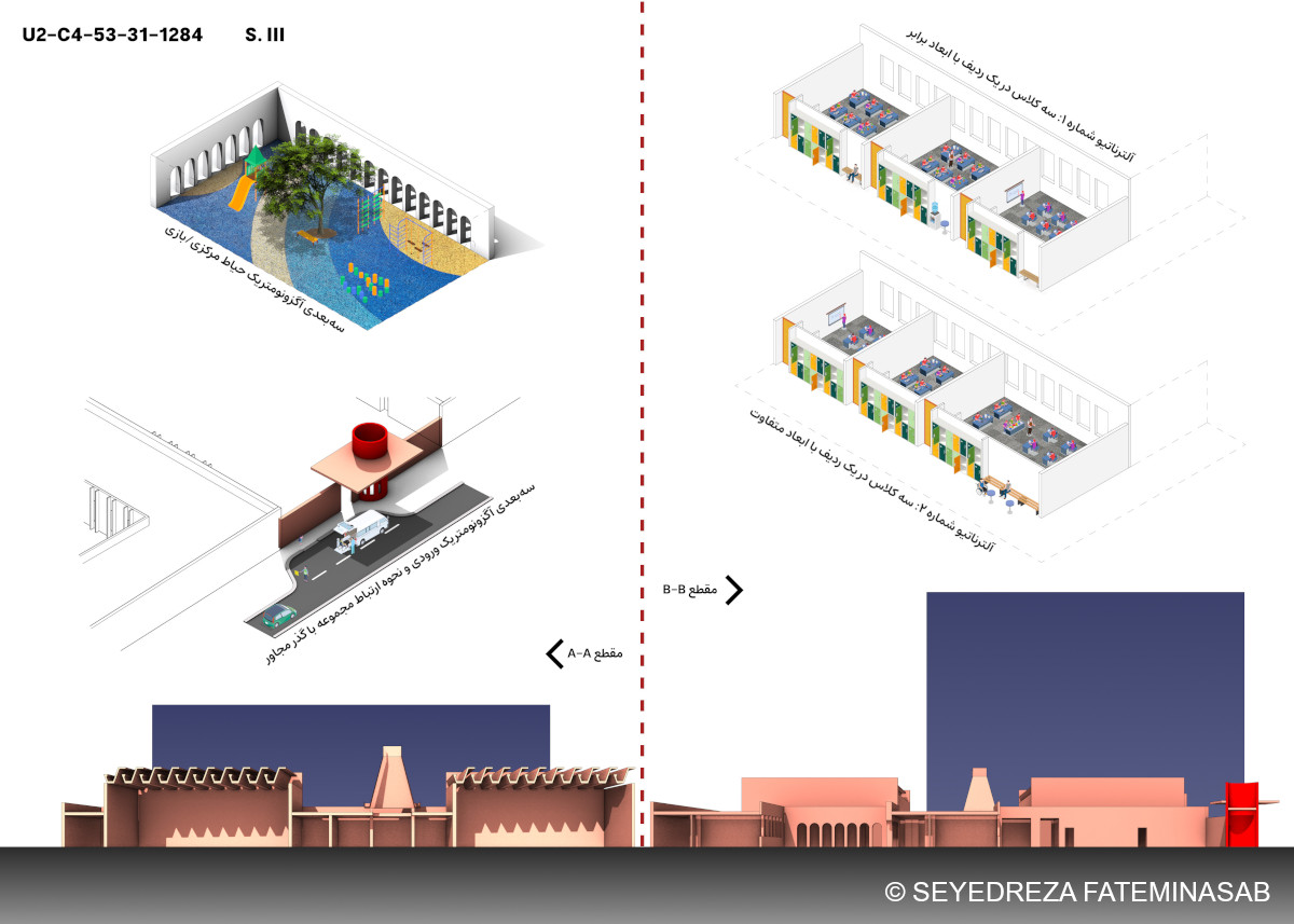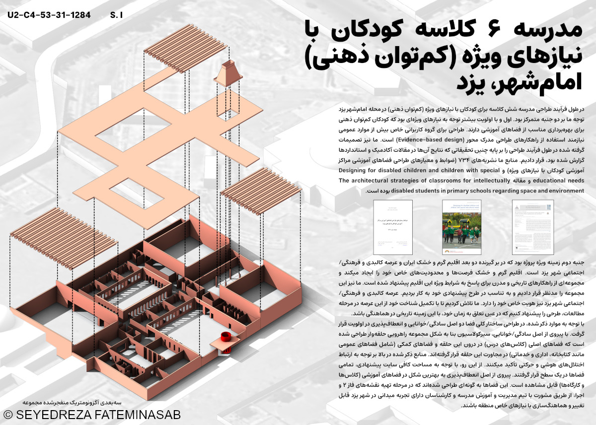 During the design process of a six-classroom school for children with special needs (intellectual disabilities) in the Imamshahr neighborhood of Yazd, my attention was focused on two main aspects. First, and with greater priority, I focused on the specific needs that children with intellectual disabilities have in order to appropriately utilize educational spaces. Designing for a specific user group requires more than general considerations and necessitates the use of evidence-based design strategies. I based my design decisions on such research, the results of which have been published in academic papers and building standards. My resources included publications #734 (Guidelines and Criteria for Designing Educational Spaces for Children with Special Needs) and #102 (Designing for Disabled Children and Children with Special Educational Needs) and the article “The Architectural Strategies of Classrooms for Intellectually Disabled Students in Primary Schools Regarding Space and Environment.“