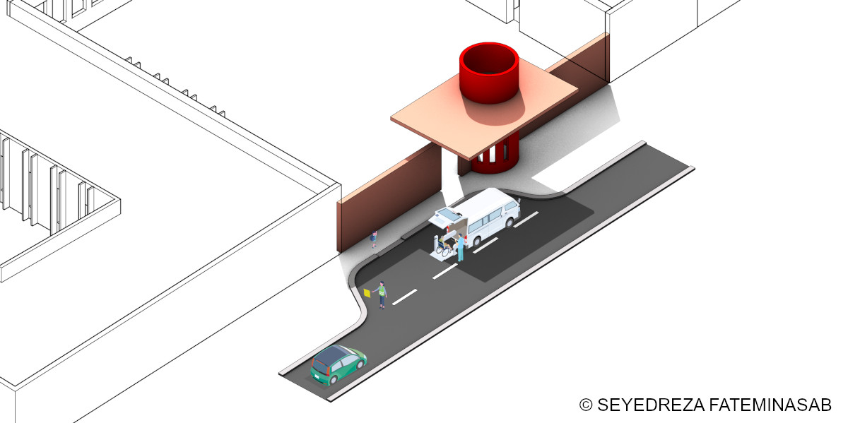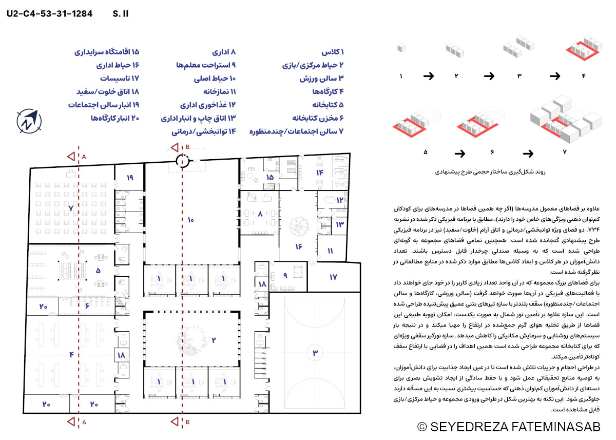 In light of the above factors, two principles were prioritized in the design of the overall space structure: simplicity/readability and flexibility. Following the principle of simplicity/readability, the building’s circulation was designed in the form of a looped corridor, with the main spaces (classrooms) placed within this loop and auxiliary spaces (including public spaces such as the library, administration, and service areas) positioned adjacent to it. The mentioned resources emphasize the connection between cognitive and motor impairments, which led me to place all spaces on a single level, given the ample area of the proposed site. The principle of flexibility is best reflected in the educational spaces (classrooms and workshops). These spaces were designed in a way that, during the preparation of phase 2 drawings and construction, they could be adjusted and coordinated with the specific needs of the region through consultation with the school management team and field-experienced experts in Yazd.