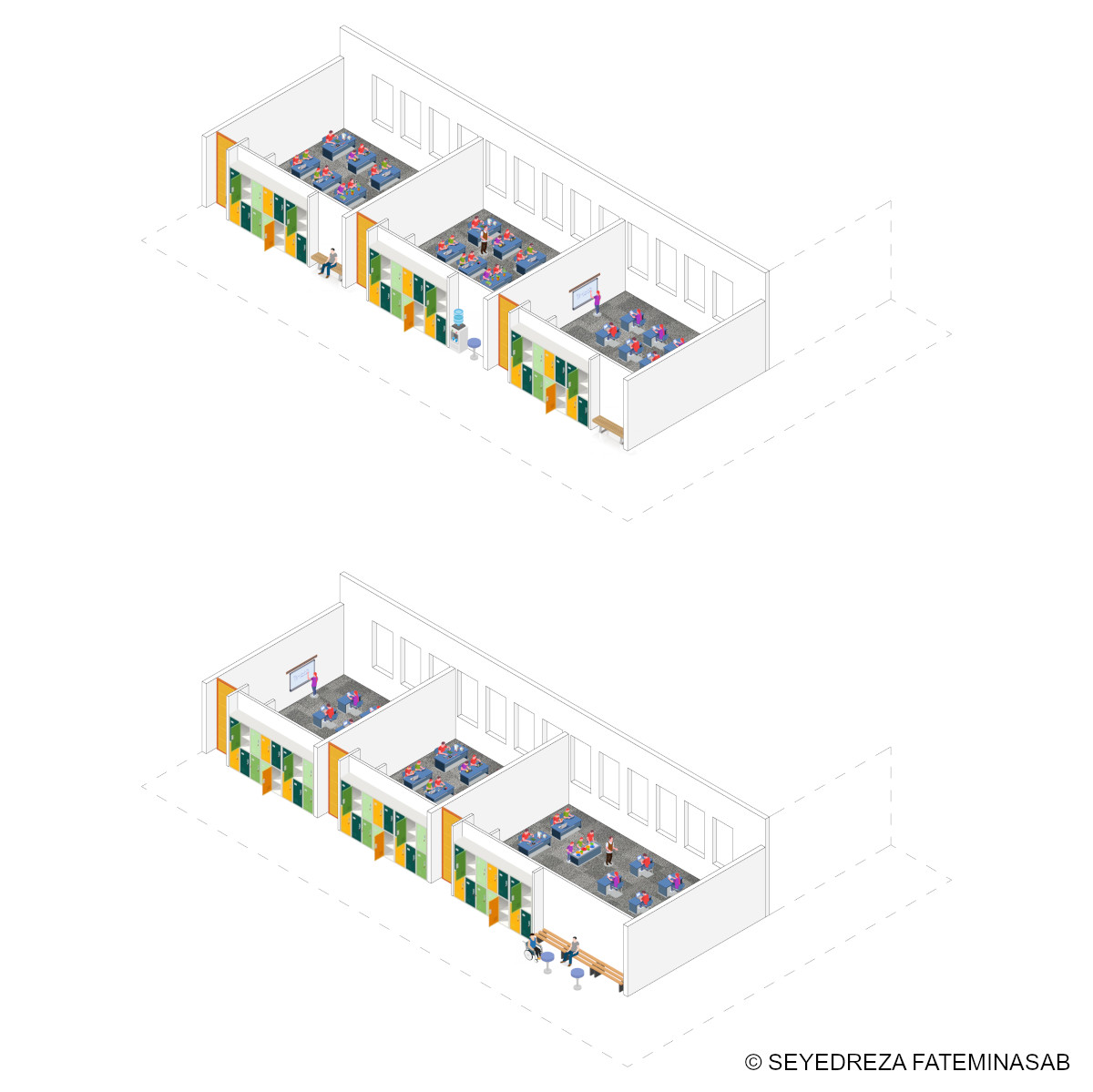 In addition to the typical school spaces (which, in schools for children with intellectual disabilities, require their own specific features), in accordance with the physical program mentioned in publication #734, two special spaces for rehabilitation/therapy and a calming room (quiet/white room) were also incorporated into the proposed design. Furthermore, all spaces in the complex were designed to be wheelchair accessible. The number of students in each classroom and the dimensions of the classrooms were considered in accordance with the guidelines provided in the study resources.